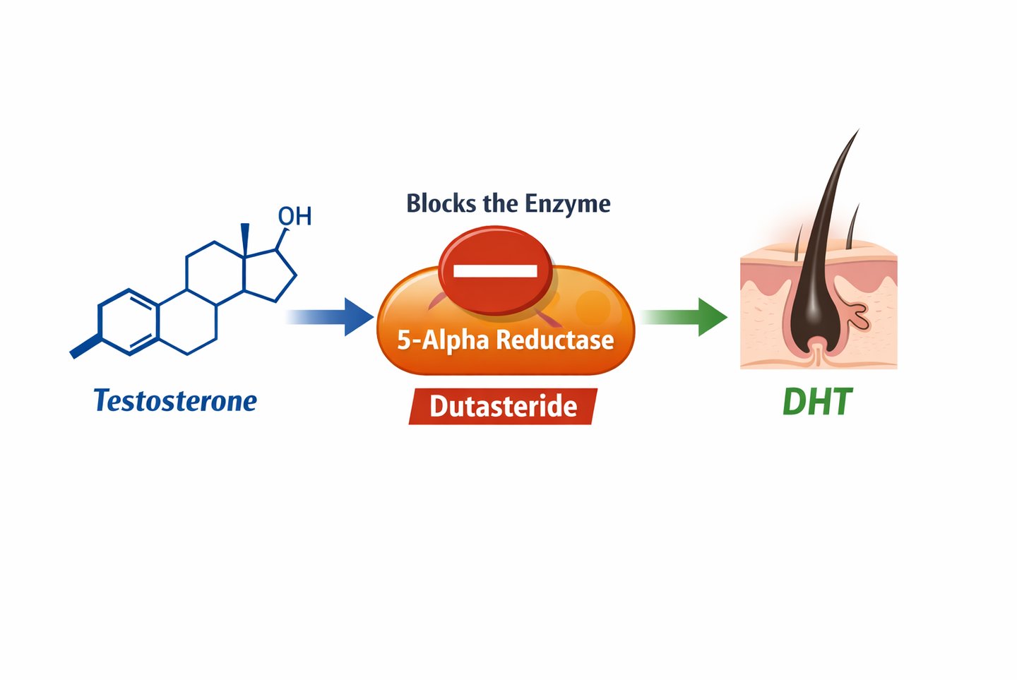 Dutasteride is a medication used to treat pattern hair loss by reducing levels of dihydrotestosterone (DHT) — the hormone most responsible for hair follicle miniaturisation in genetically susceptible individuals. Specifically, it blocks the 5AR enzyme.