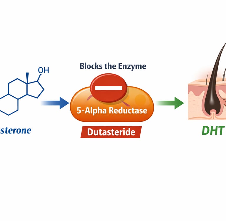 Dutasteride is a medication that works by blocking the conversion of testosterone into dihydrotestosterone (DHT), the hormone most strongly associated with pattern hair loss. When used as an injectable treatment into the scalp, the goal is to reduce local DHT levels around hair follicles while minimising whole-body exposure.