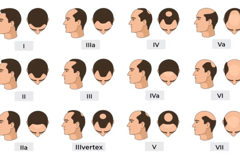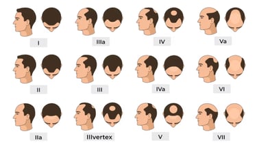 The Hamilton-Norwood Scale is a classification system used to measure the severity of male pattern baldness (androgenetic alopecia). It consists of seven stages, showing progressive hair loss: