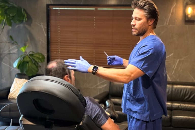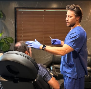 PRP therapy has emerged as an innovative solution for hair loss. Harnessing the body's natural healing processes, PRP involves extracting up to 60 ml amount of your blood via a venous cannula, processing it to concentrate the platelets, and re-injecting it into the scalp. You receive one injection per square cm for the treatment area needed, meaning some treatments will require up to 100 injections subcutaneously. For most effective results, we recommend repeating the treatment 3-6 monthly. Effects will decline 12 months after the final treatment, if the treatment is not continued.